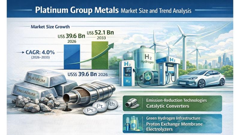 Platinum Group Metals Market: Growth, Trends, and Future OutlookAccording to the latest study by Persistence Market Research, the global Platinum Group Metals (PGMs) market is expected to be valued at US$ 39.6 billion in 2026 and is projected to reach US$ 52.1 billion by 2033, growing at a compound annual growth rate (CAGR) of 4.0% between 2026 and 2033. This steady growth reflects the increasing importance of PGMs across a wide range of industrial, technological, and environmental applications.