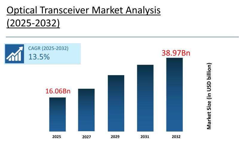 The global optical transceiver market was valued at USD 14.10 billion in 2024. It is projected to reach USD 38.97 billion by 2032, growing at a CAGR of 13.5% during the forecast period of 2025-2032. The single most important growth driver is the rapid proliferation of data centers and cloud infrastructure - driven by AI workloads, machine learning, and big data processing - which is generating accelerating demand for high-speed…
