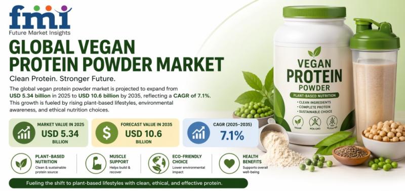 The global vegan protein powder market is projected to grow from USD 5.34 billion in 2025 to USD 10.6 billion by 2035, registering a CAGR of 7.1% during the forecast period. Rising awareness regarding plant-based diets, increasing concerns around sustainability, and growing demand for allergen-free nutritional supplements are driving market growth worldwide.Consumers are increasingly turning toward vegan protein powders as healthier alternatives to traditional whey-based supplements. The market is gaining traction among athletes, fitness enthusiasts, vegans, and consumers with lactose intolerance or dairy sensitivities. Expanding awareness around clean-label products, ethical sourcing, and environmentally friendly ingredients is further supporting demand.