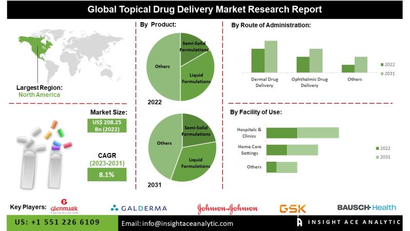InsightAce Analytic Pvt. Ltd. announces the release of a market assessment report on the "Global Topical Drug Delivery Market Size, Share & Trends Analysis Report By Type (Semi-solids (Creams, Gels, Lotions), Solids (Suppositories), Liquids (Solutions), Transdermal Products), Route (Dermal, Ophthalmic), Facility of Use (Homecare setting, Hospitals, Burn Centres), Region, Market Outlook And Industry Analysis 2031"Topical Drug Delivery Market Size is valued at USD 208.25 billion in 2022 and is predicted to reach USD 418.70 billion by the year 2031 at a 8.1% CAGR during the forecast period for 2023-2031.
