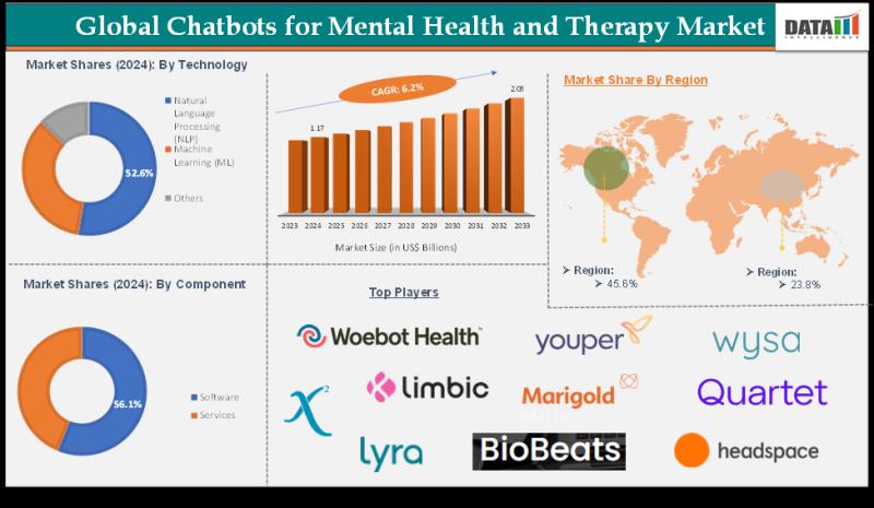 Chatbots for Mental Health and Therapy Market to Reach US$2.03 Billion by 2033 at 6.2% CAGR; North America Leads with 42% Share - Key Players: Woebot Health, Wysa Ltd, Youper Inc.