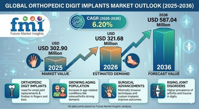 NEWARK, DE / April 6, 2026 - The global orthopedic digit implants market is poised for robust growth, expanding from USD 321.68 million in 2026 to USD 587.04 million by 2036, registering a CAGR of 6.20% over the forecast period, according to Future Market Insights (FMI). Growth is being fueled by increasing prevalence of digit-related disorders, rising demand for reconstructive orthopedic procedures, and rapid adoption of advanced implant technologies.The market reflects a growing emphasis on restoring mobility and functionality in hand and foot conditions, particularly in cases of hallux rigidus and rheumatoid arthritis. As surgical techniques evolve and implant materials improve, orthopedic digit implants are becoming essential in modern reconstructive care.