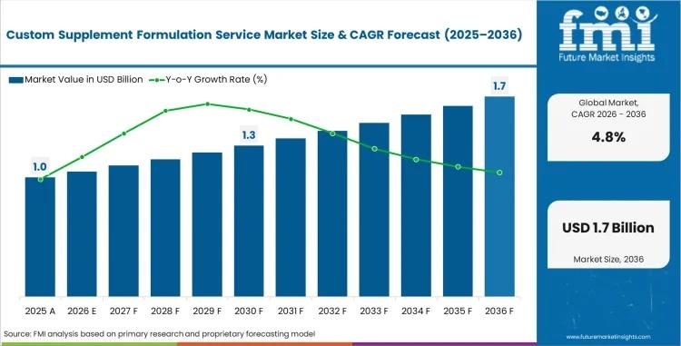 In 2025, the Custom Supplement Formulation Service Market was valued at USD 1.00 billion. According to FMI, the market is projected to reach USD 1.05 billion in 2026 and further expand to USD 1.67 billion by 2036, progressing at a CAGR of 4.8% during the forecast period.