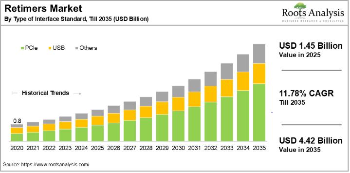 The global retimer market, valued at USD 1.45 billion in 2025, will reach USD 4.42 billion by 2035, expanding at a compound annual growth rate of 11.78% over the forecast period. This growth reflects accelerating demand for reliable, high-speed data transmission across data centers, automotive systems, and consumer electronics, as next-generation interface standards such as PCIe Gen 5/6, USB4, and CXL push the limits of signal integrity across increasingly complex hardware architectures.To explore the complete findings, request a free sample of the report at https://www.rootsanalysis.com/retimer-market/request-sample