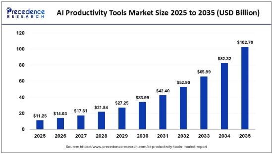 According to Precedence Research, the global AI productivity tools market size will surge from USD 11.25 billion in 2025 to nearly USD 102.70 billion by 2035, growing at a robust CAGR of 24.75% from 2026 to 2035.