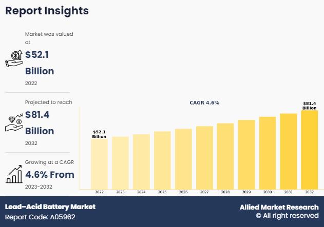 According to a new report published by Allied Market Research, the lead-acid battery market size was valued at $52.1 billion in 2022 and is projected to reach $81.4 billion by 2032, growing at a CAGR of 4.6% from 2023 to 2032.The steady growth of the lead-acid battery market is attributed to its cost-effectiveness, high recyclability, and widespread use across automotive, industrial, and backup power applications. Despite the emergence of advanced battery technologies, the lead-acid battery market continues to maintain a strong position due to its reliability and established infrastructure.