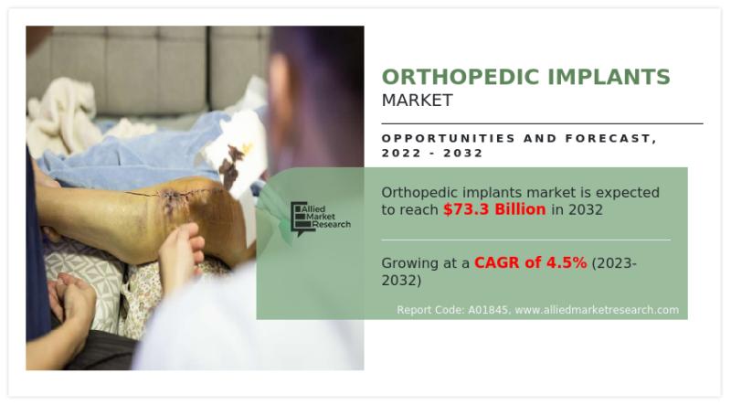 Allied Market Research published a report titled, "Orthopedic Implants Market by Product Type (Reconstructive Joint Replacements, Spinal Implants, Dental Implants, Trauma, Orthobiologics, Others), by Biomaterial (Metallic, Ceramic, Polymeric, Others), and by Type (Knee, Hip, Wrist and Shoulder, Dental, Spine, Ankle, Others): Global Opportunity Analysis and Industry Forecast, 2022-2032." According to the report, the global orthopedic implants market was valued at USD 47.19 billion in 2022 and is projected to reach USD 73.32 billion by 2032, growing at a CAGR of 4.5% from 2023 to 2032.The report provides a comprehensive analysis of key investment opportunities, winning strategies, market drivers, and growth prospects. It also offers detailed insights into market size, estimations, competitive landscape, and emerging trends. This study serves as a valuable resource for industry leaders, new entrants, investors, and stakeholders to develop effective strategies and strengthen their market presence.