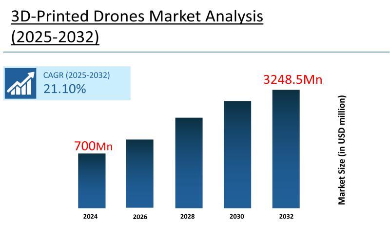 The 3D-Printed Drones Market refers to unmanned aerial vehicles manufactured using additive manufacturing technologies for lightweight, customizable, and complex components. The market is projected to reach USD 3248.5 million by 2032, growing at a CAGR of 21.10% during 2025-2032.The market is expanding from USD 700 million in 2024, driven primarily by rising demand for drones across multiple industries. This demand structurally increases because sectors such as defense, agriculture, and logistics require rapidly deployable, customized UAV solutions enabled by 3D printing.