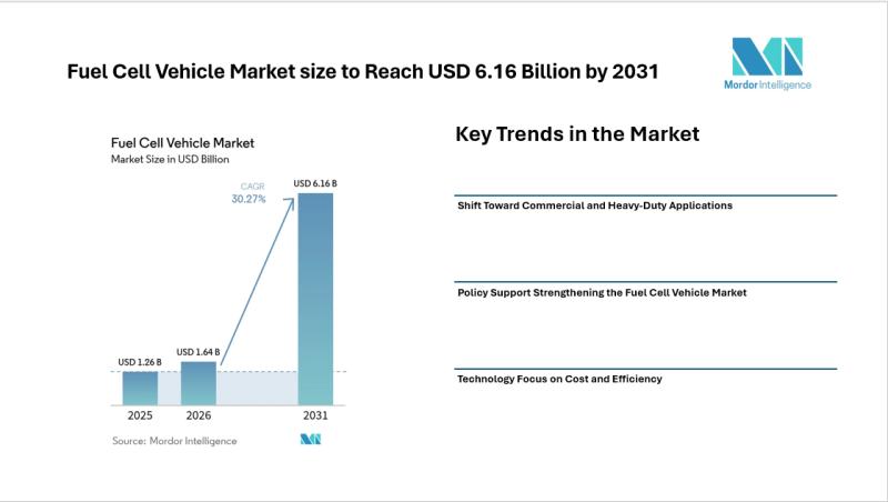 According to Mordor Intelligence, the fuel cell vehicle market is valued at USD 1.64 billion in 2026, rising from USD 1.26 billion in 2025 and expected to reach USD 6.16 billion by 2031, growing at a CAGR of 30.27% during the forecast period. This reflects strong market growth supported by policy backing and increasing commercial use cases.