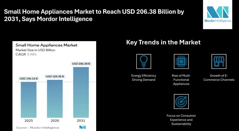 According to Mordor Intelligence, the small home appliances market size is projected to grow from USD 146.16 billion in 2025 to USD 154.35 billion in 2026 and further reach USD 206.38 billion by 2031, reflecting steady expansion at a CAGR of 5.98%. This consistent rise in the market is closely linked to changing urban lifestyles, increased disposable incomes, and the growing need for convenience-oriented household solutions.