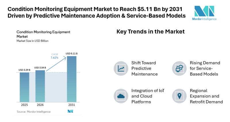 According to Mordor Intelligence, the condition monitoring equipment market size was valued at USD 3.29 billion in 2025 and is estimated to grow to USD 3.54 billion in 2026, reaching USD 5.11 billion by 2031, at a CAGR of 7.62% during…