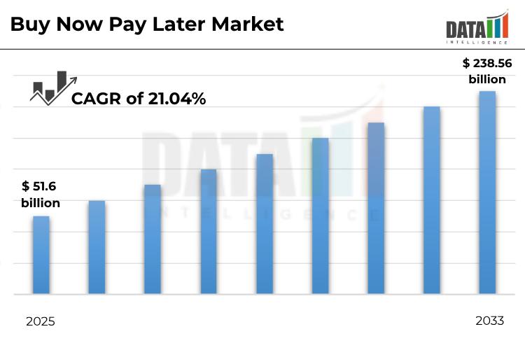 "The global buy now pay later market reached US$ 51.6 billion in 2025, and is expected to reach US$ 238.56 billion by 2033, growing at a CAGR of 21.04% during the forecast period 2026-2033."DataM Intelligence unveils exclusive insights into the Buy Now Pay Later Market 2026, highlighting emerging trends, growth drivers, and key regional opportunities worldwide. The report helps solve critical business challenges by identifying high-growth segments and reducing investment risks through actionable forecasts. With in-depth competitive benchmarking, it enables smarter strategies and confident decision-making. Leveraging these insights allows stakeholders to stay ahead of market shifts and maximize returns.