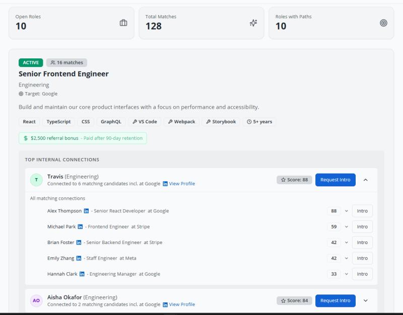 Supporting features include fuzzy role matching (so a "Member of Technical Staff" correctly matches a "Software Engineer" requisition), a referral queue that tracks every introduction sent, a leaderboard that keeps employees engaged over time, backchannel reference checks, and ATS integration to keep live roles flowing into the engine automatically.