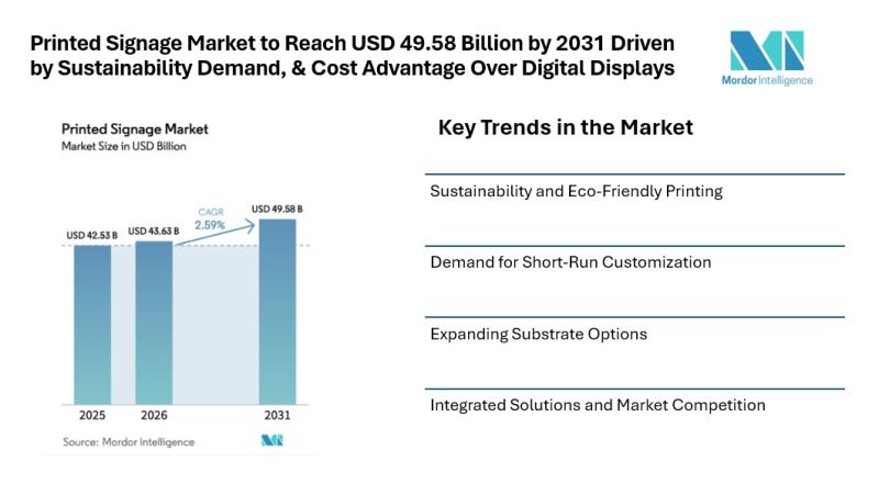 According to Mordor Intelligence, the printed signage market size [https://www.mordorintelligence.com/industry-reports/printed-signage-market?utm_source=abnewswire] is projected to expand from USD 42.53 billion in 2025 and USD 43.63 billion in 2026 to USD 49.58 billion by 2031, registering a CAGR of 2.59% between 2026 and 2031. This growth is driven…