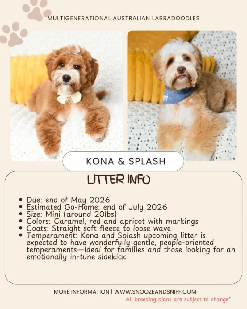 Families exploring the breeder's upcoming Australian Labradoodle litters [https://www.snoozeandsniff.com/litter/] can expect several pairings scheduled for late spring and early summer.