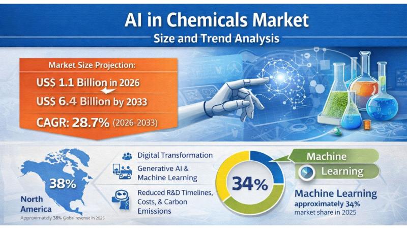AI in Chemicals Market Size and Trend AnalysisThe integration of artificial intelligence (AI) into the chemicals industry is transforming traditional processes, enabling faster innovation, improved efficiency, and more sustainable operations. The global AI in chemicals market is expected to be valued at US$ 1.1 billion in 2026 and is projected to reach US$ 6.4 billion by 2033, expanding at an exceptional compound annual growth rate (CAGR) of 28.7% during the forecast period. This rapid growth highlights the increasing reliance on digital technologies to address complex challenges across the chemical value chain.