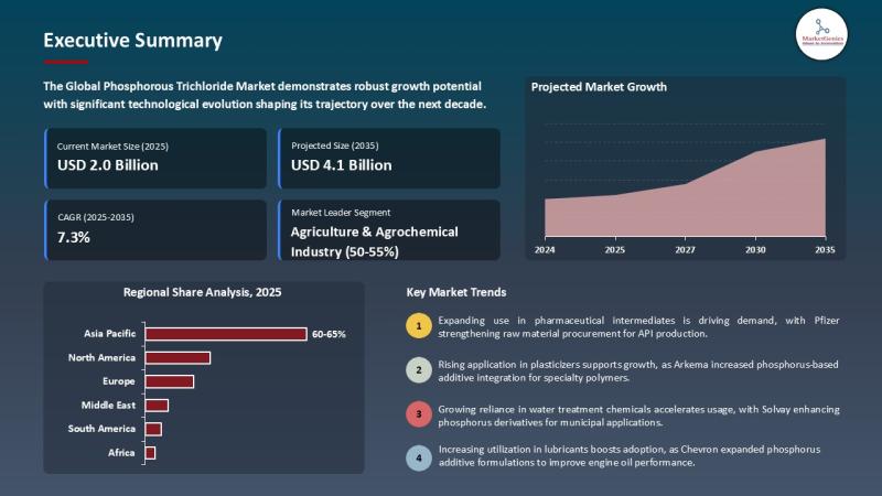 Wilmington, DE, USA, 8th April 2026 - According to MarketGenics Global Research, the global phosphorous trichloride market is valued at approximately USD 2.0 billion in 2025 and is projected to reach USD 4.1 billion by 2035, expanding at a CAGR of 7.3% during the forecast period (2025-2035). The market is experiencing strong growth as phosphorous trichloride (PCl3) continues to serve as a critical intermediate in agrochemicals, pharmaceuticals, flame retardants, and…
