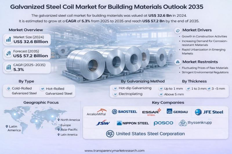 The global galvanized steel coil market for building materials was valued at US$ 32.6 billion in 2024 and is projected to reach US$ 57.2 billion by 2035, expanding at a CAGR of 5.3% from 2025 to 2035. Market growth is primarily driven by increasing urbanization, expanding infrastructure development, and rising demand for durable, corrosion-resistant construction materials.