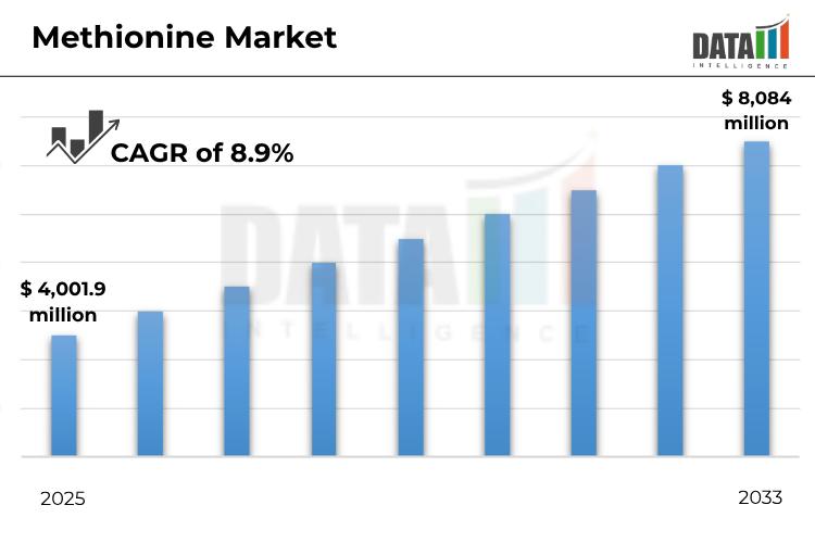 "The Global Methionine Market reached US$ 4,001.9 million in 2025 and is expected to reach US$ 8,084 million by 2033, growing with a CAGR of 8.9% during the forecast period 2026-2033."DataM Intelligence unveils exclusive insights into the Methionine Market 2026, highlighting emerging trends, growth drivers, and key regional opportunities worldwide. The report helps solve critical business challenges by identifying high-growth segments and reducing investment risks through actionable forecasts. With in-depth competitive benchmarking, it enables smarter strategies and confident decision-making. Leveraging these insights allows stakeholders to stay ahead of market shifts and maximize returns.