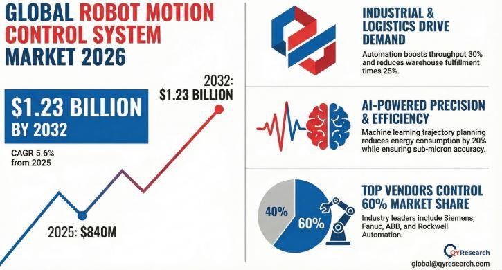 Robot Motion Control Systems are core subsystems that manage and coordinate robotic joint and actuator movements for precise operation. They integrate motion controllers, servo drives, feedback sensors (encoders), and algorithms to regulate position, velocity, acceleration, and torque via real-time closed-loop feedback. Production spans upstream components like microprocessors, FPGAs, servo motors, and RTOS software; midstream manufacturing of controllers and drives; and downstream integration into robots by OEMs. These systems ensure synchronized…