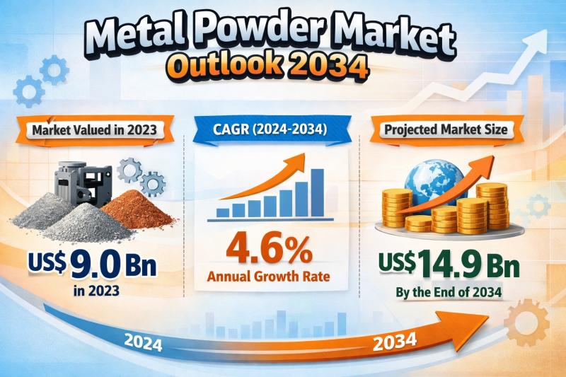 The global metal powder market was valued at US$ 9.0 billion in 2023 and is projected to reach US$ 14.9 billion by 2034, expanding at a compound annual growth rate (CAGR) of 4.6% during the forecast period from 2024 to 2034. This steady growth trajectory reflects the increasing adoption of advanced manufacturing technologies and the expanding application base of metal powders across industries such as automotive, aerospace, electronics, and machinery.