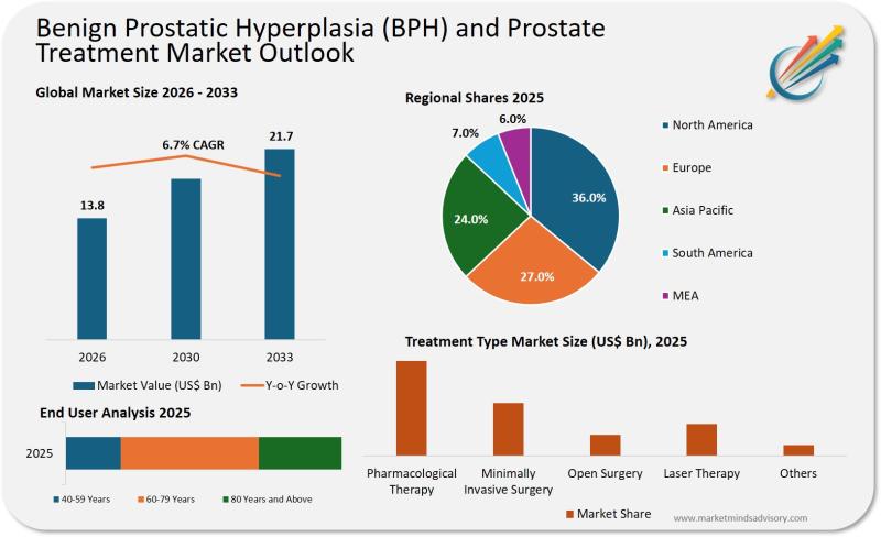 The Benign Prostatic Hyperplasia (BPH) and Prostate Treatment Market is positioned for robust expansion, with Market Minds Advisory projecting growth from USD 13.8 billion in 2026 to USD 21.7 billion by 2033. The market's trajectory is underpinned by the increasing prevalence of BPH among aging male populations, heightened awareness of prostate health, and the rising adoption of minimally invasive therapies. Pharmaceutical innovations,…
