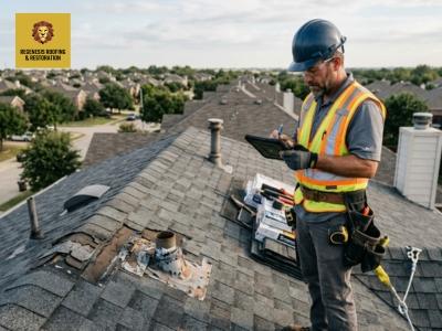 Professional inspector from a Roofing Company in Cedar Park assessing a residential roof for storm damage.