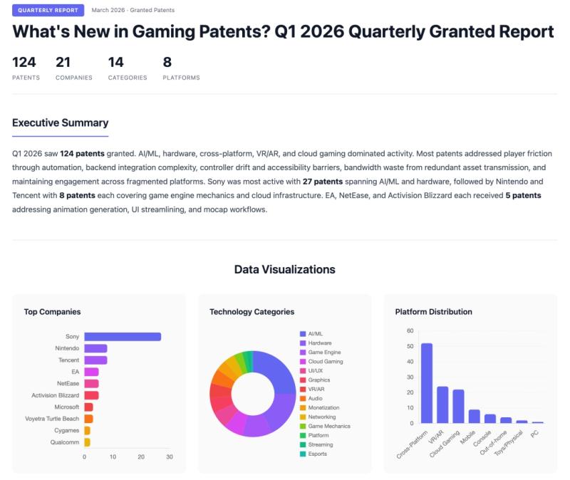 The full Q1 2026 Quarterly Granted Report [https://futureofgaming.com/publications/quarterly/2026-q1-gaming-patents-granted], including detailed technology trend analysis, platform distribution breakdowns, company strategy sections, and emerging theme identification, is available at futureofgaming.com/publications.