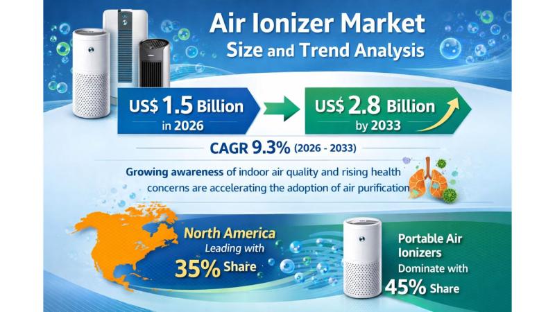 According to Persistence Market Research, the global Air Ionizer market is anticipated to grow significantly from roughly US$ 1.5 billion in 2026 to US$ 2.8 billion by 2033, representing a strong compound annual growth rate (CAGR) of approximately 9.3% between 2026 and 2033.