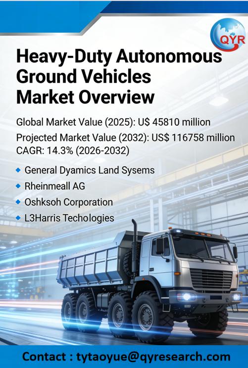Unlock the Future of the Heavy-Duty Autonomous Ground Vehicles Market: Comprehensive Global Market Report 2026-2032Global leading market research publisher QYResearch published the release of its latest report, "Heavy-Duty Autonomous Ground Vehicles - Global Market Share, Ranking, Sales, and Demand Forecast 2026-2032". This in-depth report provides a complete analysis of the global Heavy-Duty Autonomous Ground Vehicles market, offering critical insights into market size, share, demand, industry development status, and future forecasts. Whether you're a stakeholder, investor, or industry player, this report equips you with the data and strategies needed to stay ahead in a rapidly evolving market.