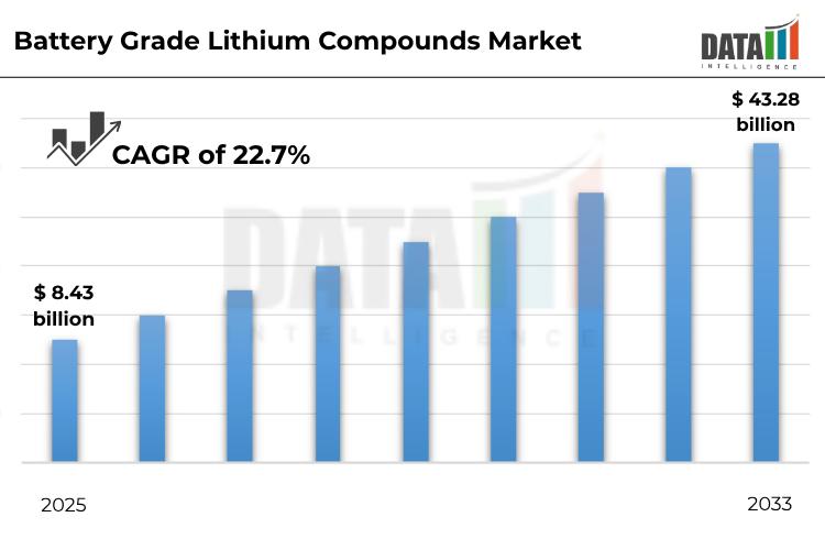 "Global Battery Grade Lithium Compounds Market reached US$ 8.43 billion in 2025 and is expected to reach US$ 43.28 billion by 2033, growing with a CAGR of 22.7% during the forecast period 2026-2033."