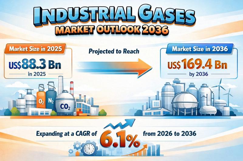 The global industrial gases market is witnessing steady and sustained expansion, driven by rising demand across diverse end-use industries. The market was valued at USD 88.3 billion in 2025 and is projected to reach USD 169.4 billion by 2036, growing at a compound annual growth rate (CAGR) of 6.1% from 2026 to 2036.