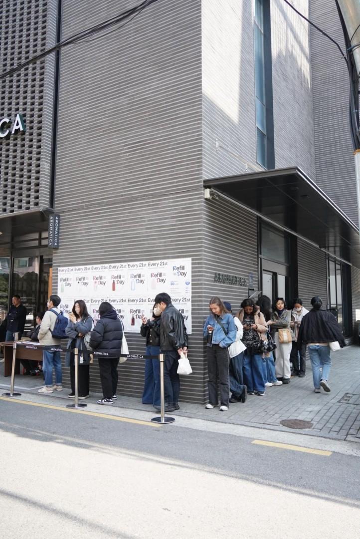 Apr 9, 2026 - KOREA - On the 21st of every month, a unique scene unfolds in front of AROMATICA's headquarters in Seoul. People line up carrying empty containers-detergent bottles, glass jars, and used shampoo bottles-each reflecting everyday use. Instead of purchasing new products, they return to refill what they already have.