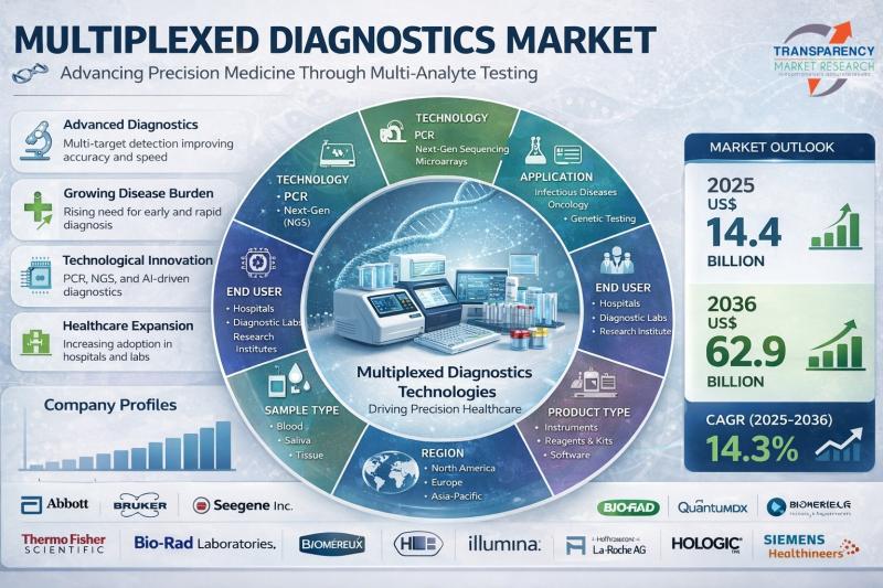 The global multiplexed diagnostics market was valued at US$ 14.4 Billion in 2025 and is projected to reach US$ 62.9 Billion by the end of 2036, expanding at a CAGR of 14.3% from 2026 to 2036. Market growth is driven by increasing demand for rapid and accurate diagnostic solutions, rising prevalence of infectious and chronic diseases, and advancements in molecular diagnostics technologies.