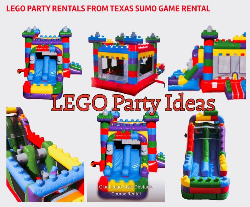 Texas Sumo Game Rental showcases LEGO-themed party rentals with multiple inflatables for school events, festivals, and large gatherings across Dallas-Fort Worth.