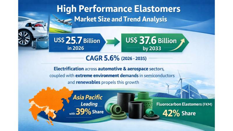 Market Overview and Size AnalysisAccording to Persistence Market Research, the global high performance elastomers market is projected to be valued at US$ 25.7 billion in 2026 and is expected to reach US$ 37.6 billion by 2033, expanding at a CAGR of 5.6% during the forecast period.
