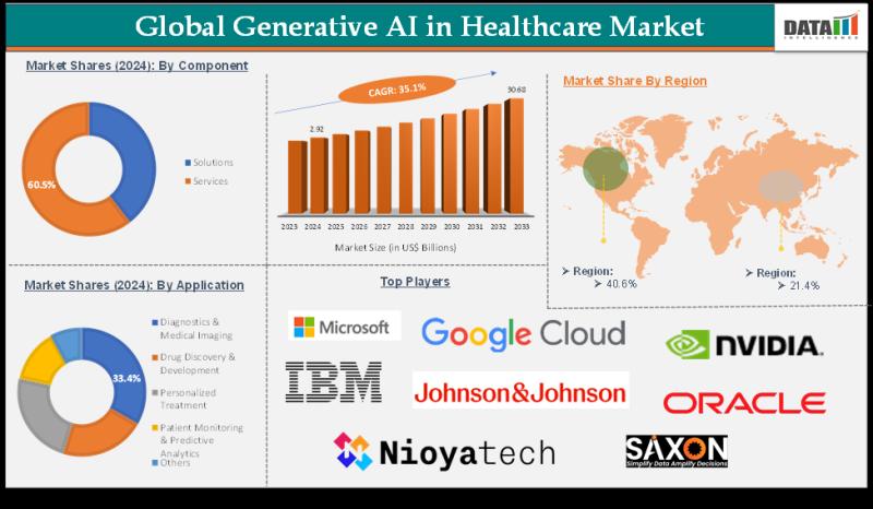 The Global Generative AI in Healthcare Market reached US$ 2.92 billion in 2024 and is expected to reach US$ 30.68 billion by 2033, growing at a CAGR of 35.1% during the forecast period 2025-2033, according to DataM Intelligence.