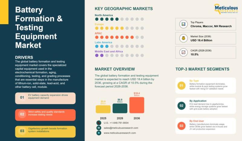 The global battery formation and testing equipment market is witnessing robust growth, driven by the rapid expansion of battery manufacturing and rising demand for reliable energy storage solutions. Valued at USD 5.6 billion in 2025, the market is projected to reach USD 6.8 billion in 2026 and further grow to USD 18.4 billion by 2036, registering a CAGR of 10.5% during the forecast period. This steady expansion reflects the increasing…