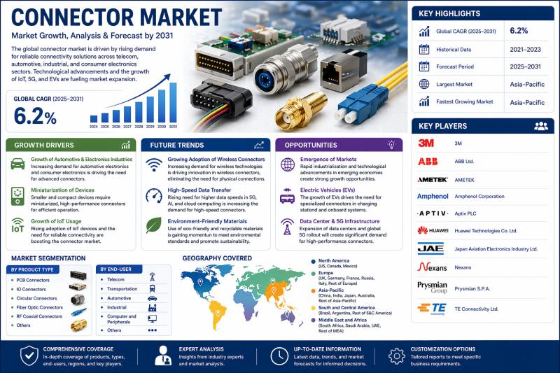 The Insight Partners has released an in‐depth analysis of the global Connector Market Analysis, highlighting strong growth prospects driven by rising demand across telecommunications, automotive, industrial automation, and consumer electronics sectors. As electronic devices become more compact, powerful, and interconnected, connectors continue to play a crucial role in enabling seamless power, data, and signal transmission across systems worldwide.