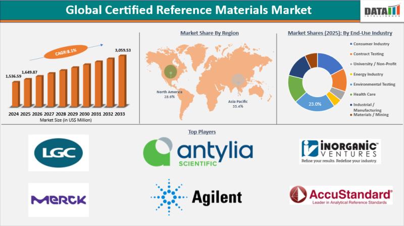 The Certified Reference Materials Market reached US$ 1,649.87 Million in 2025 and is expected to reach US$ 3,059.53 Million by 2033, growing with a CAGR of 8.1% during the forecast period 2026-2033 driven by the increasing need for accurate analytical testing, quality assurance, and regulatory compliance across multiple industries.