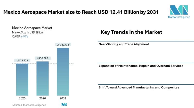 According to Mordor Intelligence, the Mexico aerospace market size [https://www.mordorintelligence.com/industry-reports/aerospace-industry-in-mexico?utm_source=abnewswire] is projected to grow from USD 8.3 billion in 2025 to USD 8.88 billion in 2026, and further reach USD 12.41 billion by 2031, registering a CAGR of 6.94% during the forecast period. The Mexico…