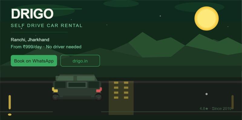 Drigo (Drigo India Cars Pvt Ltd) is a tech-enabled self drive car rental platform headquartered in Ranchi, Jharkhand. Founded in 2019, Drigo connects travellers with verified local car hosts across Jharkhand and Odisha, offering a fully digital rental experience - from WhatsApp booking and Aadhaar-based KYC to doorstep delivery and 24/7 customer support. The platform serves both leisure and business travellers in Ranchi and Bhubaneswar, with a growing fleet of hatchbacks, sedans, SUVs, and premium MPVs available from ₹999 per day. Drigo is rated 4.8 stars by its guests and is available at drigo.in.
