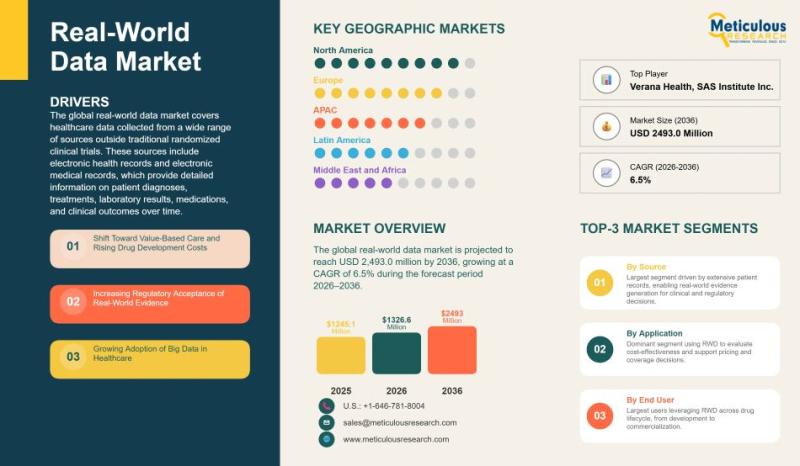 Global real-world data market set to reach USD 2.49B by 2036, driven by AI, value-based care, and healthcare digitization trends.