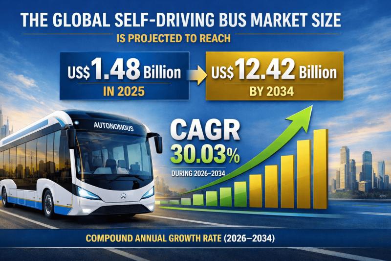 The global self‐driving bus market is witnessing accelerated growth as governments and transport authorities increasingly invest in autonomous mobility solutions. According to The Insight Partners, the global self‐driving bus market size is projected to reach US$ 12.42 billion by 2034, rising from US$ 1.48 billion in 2025. The market is anticipated to register a robust compound annual growth rate (CAGR) of 30.03% during the forecast period from 2026 to 2034,…