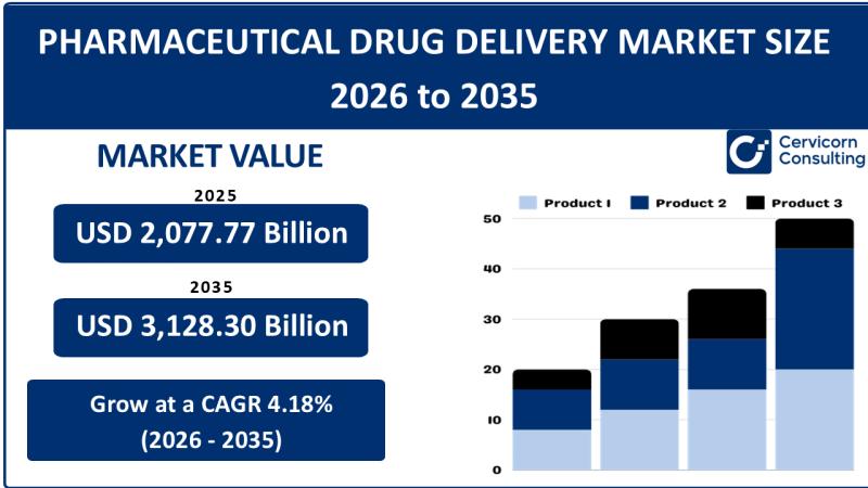 According to the report from Cervicorn Consulting, the global pharmaceutical drug delivery market was valued at USD 2,077.77 billion in 2025 and is expected to be worth around USD 3,128.30 billion by 2035, growing at a compound annual growth rate (CAGR) of 4.18% from 2026 to 2035.