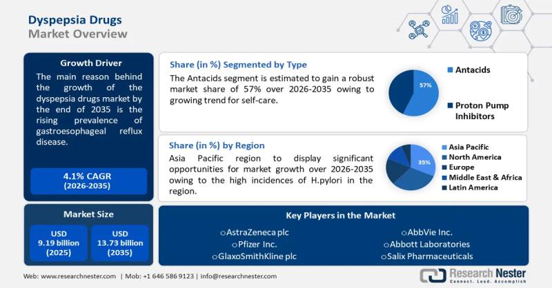 In 2025, the dyspepsia drugs market is valued at USD 9.19 billion, and it is projected to reach USD 13.73 billion by 2035, reflecting a compound annual growth rate (CAGR) of 4.1% between 2026 and 2035. This growth trajectory is supported by increasing consumption of processed foods, sedentary lifestyles, and rising incidences of gastroesophageal reflux disease (GERD) and functional dyspepsia.