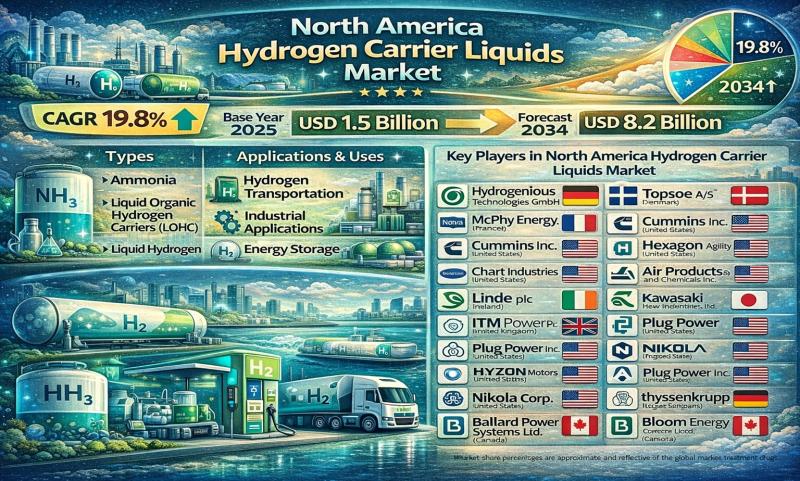 HTFMI Recently published a Study on North America Hydrogen Carrier Liquids Market, it is expected to grow at a CAGR of ~19.8% and may see the market value of ~USD 8.2 Billion by 2034, currently pegged at ~USD 1.5 Billion. While focusing on the major driving and restraining forces in this market, the report also provides a comprehensive study of future trends, hydrogen storage technologies, and clean energy innovations.