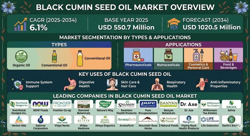 The global Black Cumin Seed Oil market is projected to grow at a CAGR of 6.1% from 2025 to 2034, increasing from USD 550.7 Million in 2025 to USD 1020.5 Million by 2034.