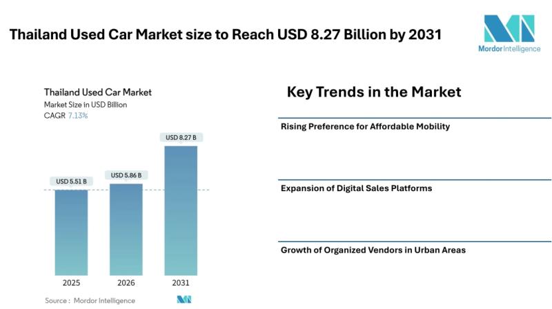 According to Mordor Intelligence, the Thailand used car market size [https://www.mordorintelligence.com/industry-reports/thailand-used-car-market?utm_source=abnewswire] was valued at USD 5.51 billion in 2025 and is estimated to grow from USD 5.86 billion in 2026 to reach USD 8.27 billion by 2031, registering a CAGR of 7.13% during…