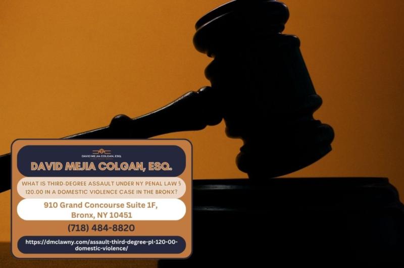 BRONX, NY - A third-degree assault charge under New York Penal Law Section 120.00 is a Class A misdemeanor carrying up to 364 days in jail, three years of probation, and fines up to $1,000, but when the charge arises from a domestic violence incident, the consequences extend far beyond criminal penalties. Bronx domestic violence defense attorney David Mejia Colgan of David Mejia Colgan, Esq. (https://dmclawny.com/assault-third-degree-pl-120-00-domestic-violence/) is providing guidance on how these charges are prosecuted in the Bronx and the defenses available to those accused.According to Bronx domestic violence defense attorney David Mejia Colgan, domestic violence assault cases in the Bronx are handled by a specialized prosecution bureau within the Bronx County District Attorney's Office located at 198 East 161st Street. This dedicated unit works closely with advocates co-located at the Bronx Family Justice Center, and the focused resources mean that prosecutors in these cases typically have specialized training in building intimate partner violence cases. "The Bronx DA's Domestic Violence Bureau approaches these cases differently than general misdemeanor prosecutions, and defendants need representation that understands those differences," explains Mejia Colgan.